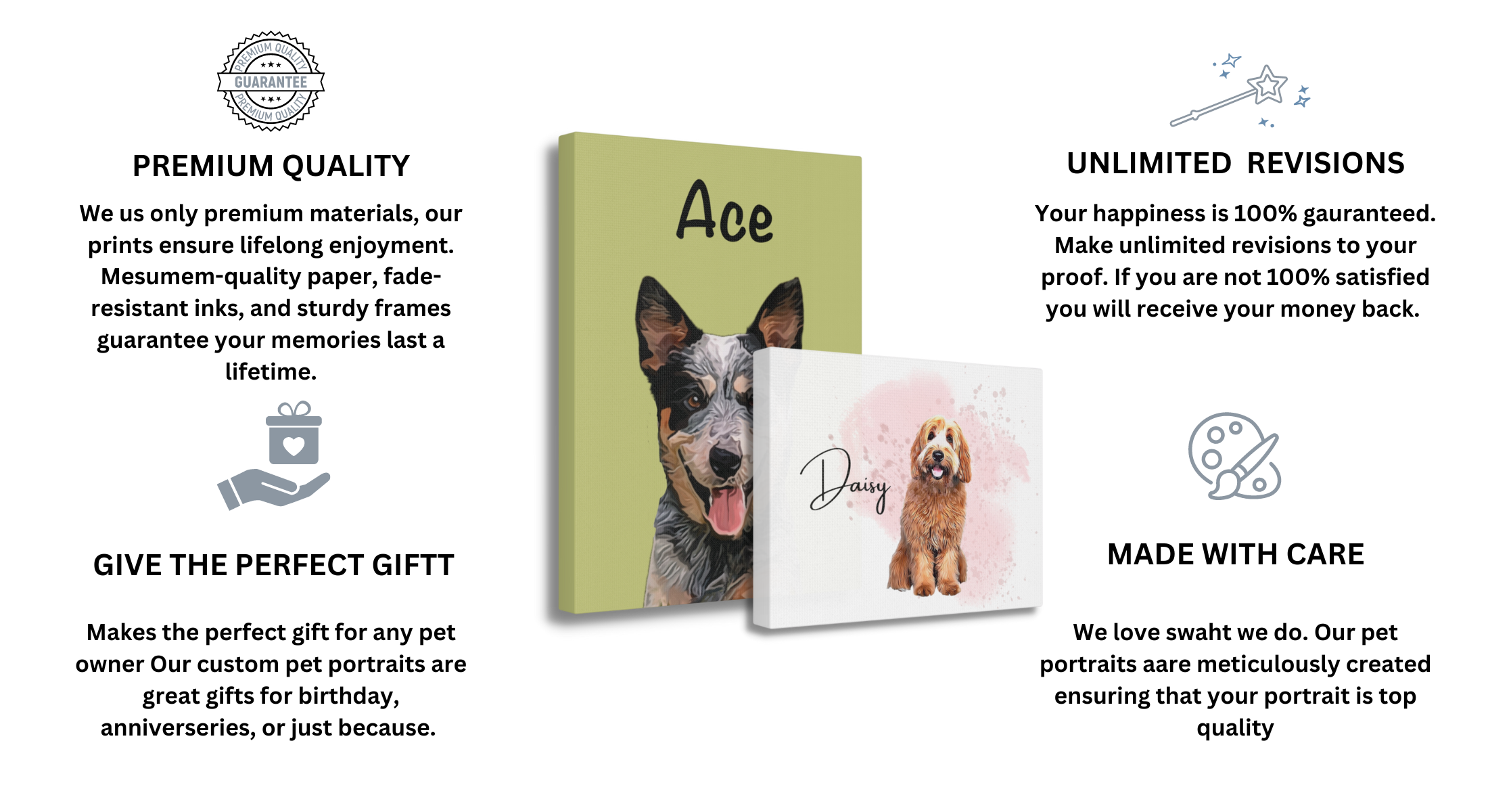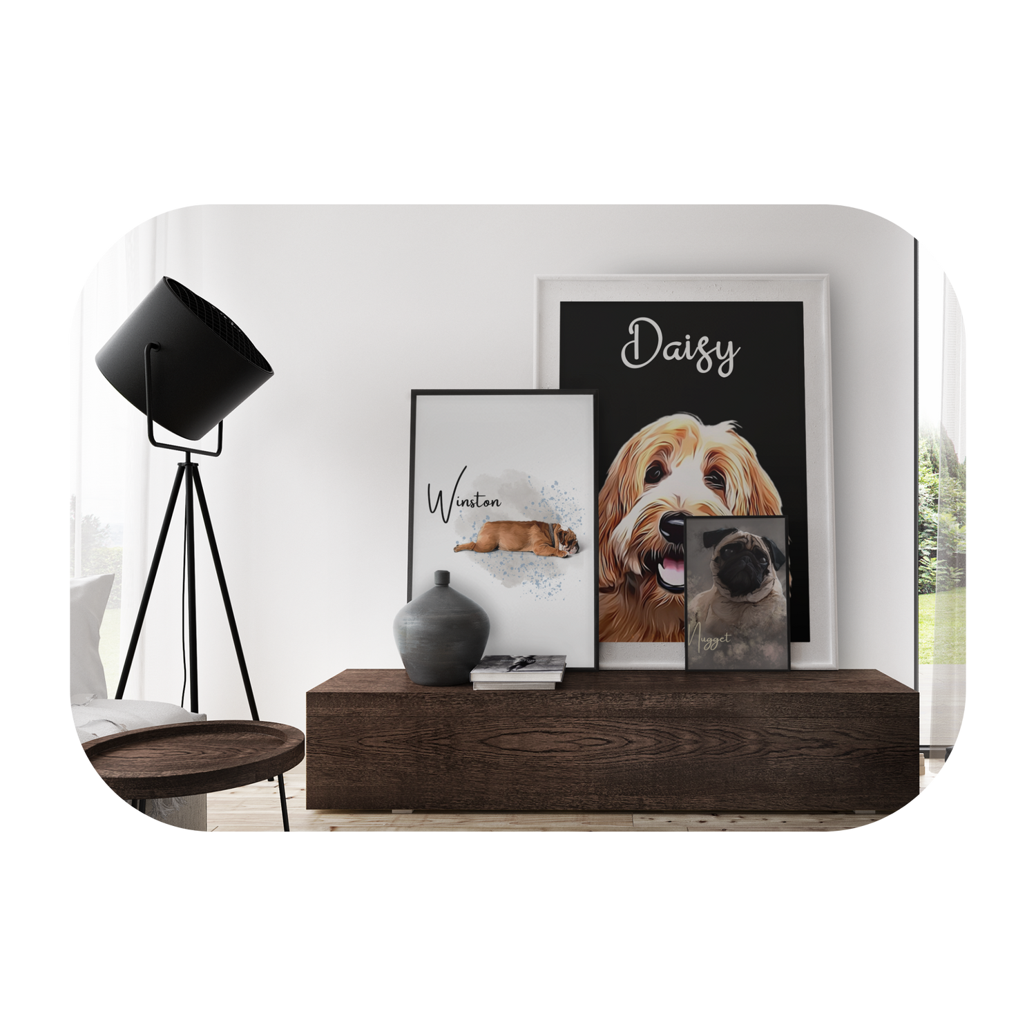 Add options that make your portrait uniquely yours. Choose your background, size, and pet's name or special message. We offer portraits in print, canvas, three different frame colors.